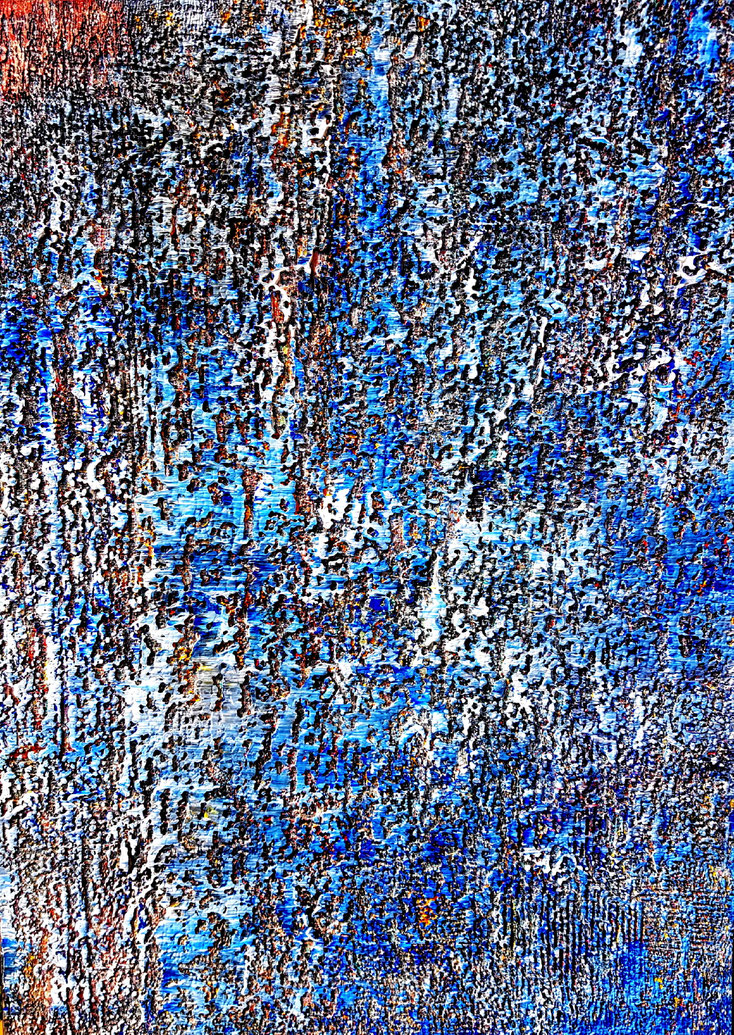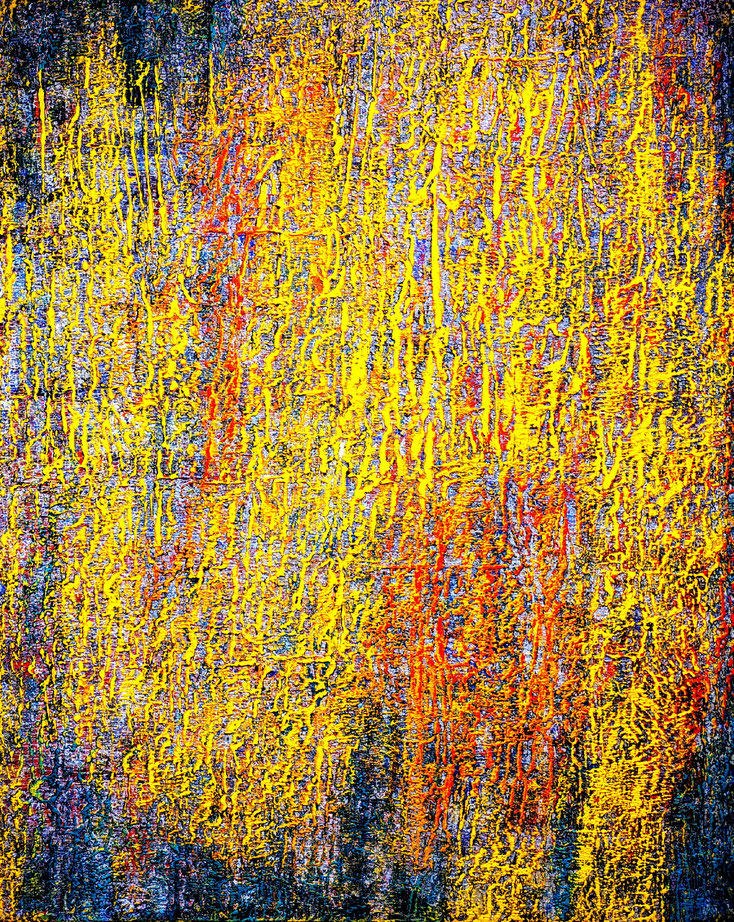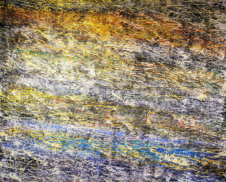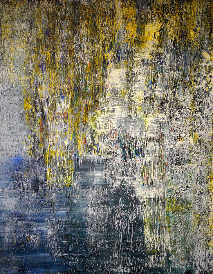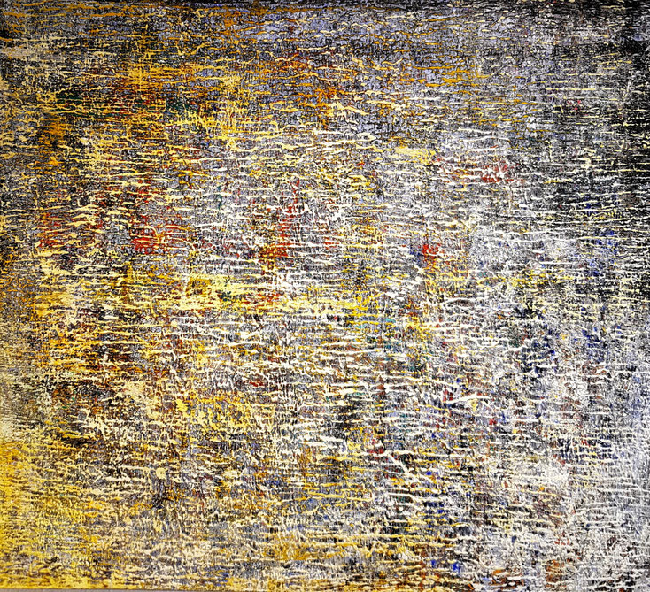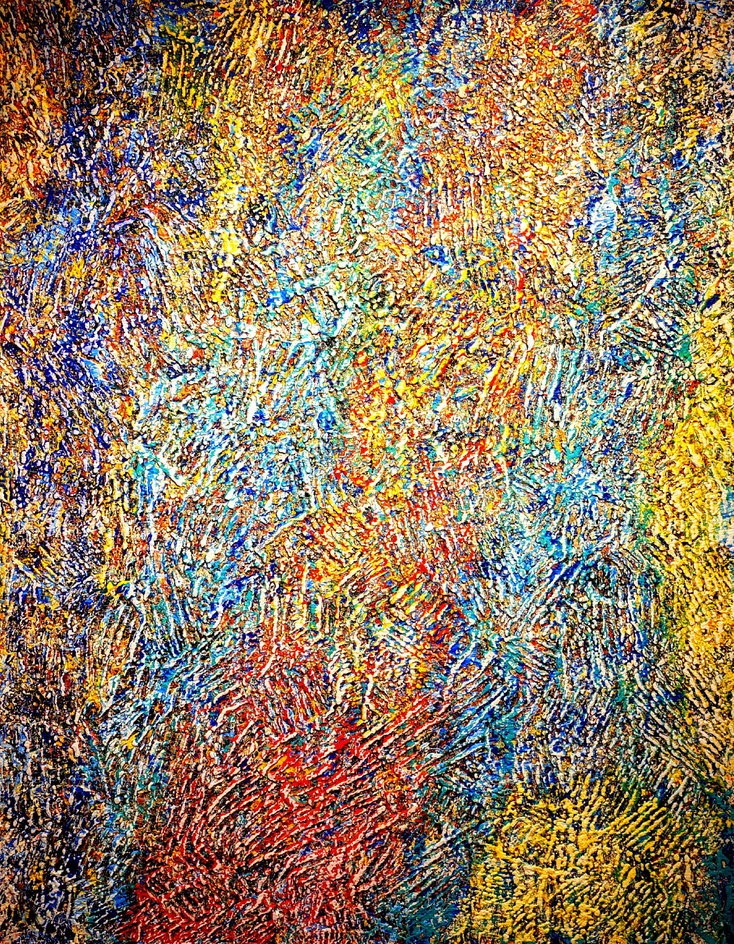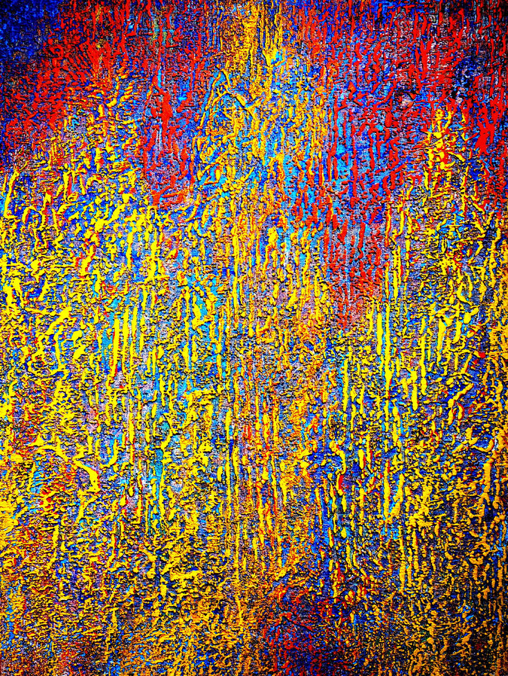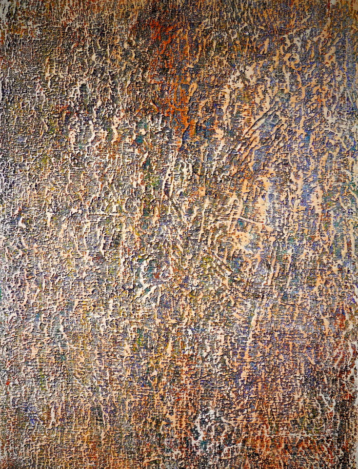 erschaffe ich Geflechte u. Systeme, die aus Farbe, Farbinseln und Farbfäden bestehen, verwoben durch unzählige, feinste Pinselbewegungen, Schicht um Schicht auf Leinwand. Mittels einer „kompositorischen Dynamik“ entstehen dabei hochkomplexe „Sphären“, die sich aus "dem Kleinsten" zusammensetzen, ein Gewebe aus unzähligen Farb- und Strukturmomenten, die in ihrer Verbindung eine einzigartige lebendige Einheit bilden. Auf diese Weise werden allem zugrunde liegende Netzwerke, Systeme, Beziehungen sichtbar. JUE