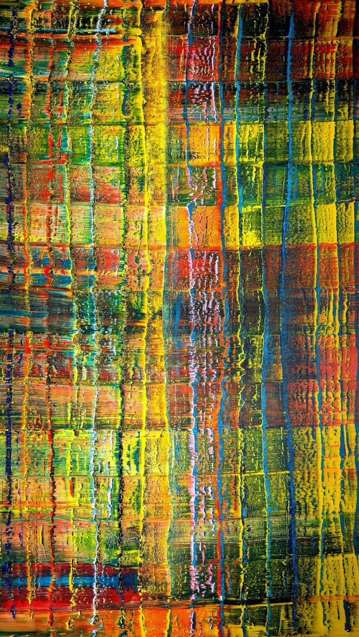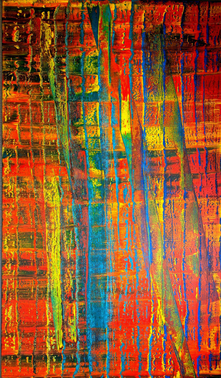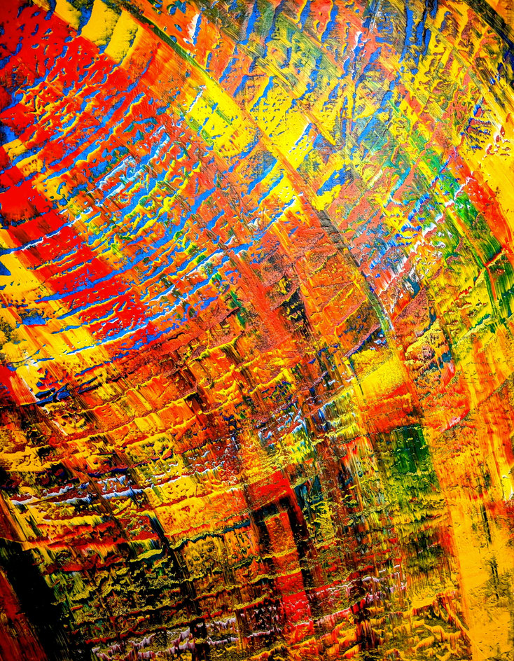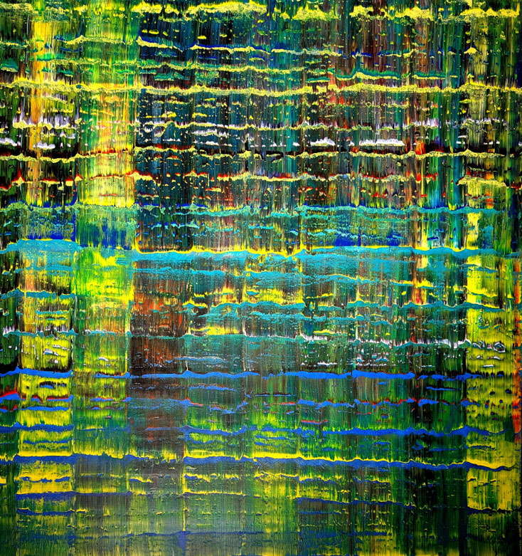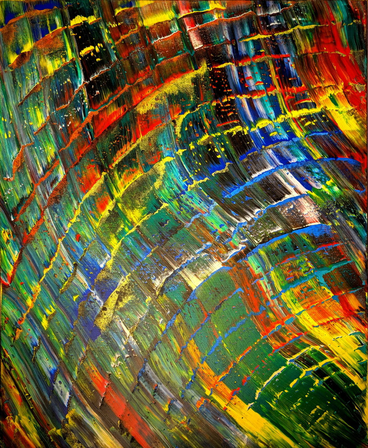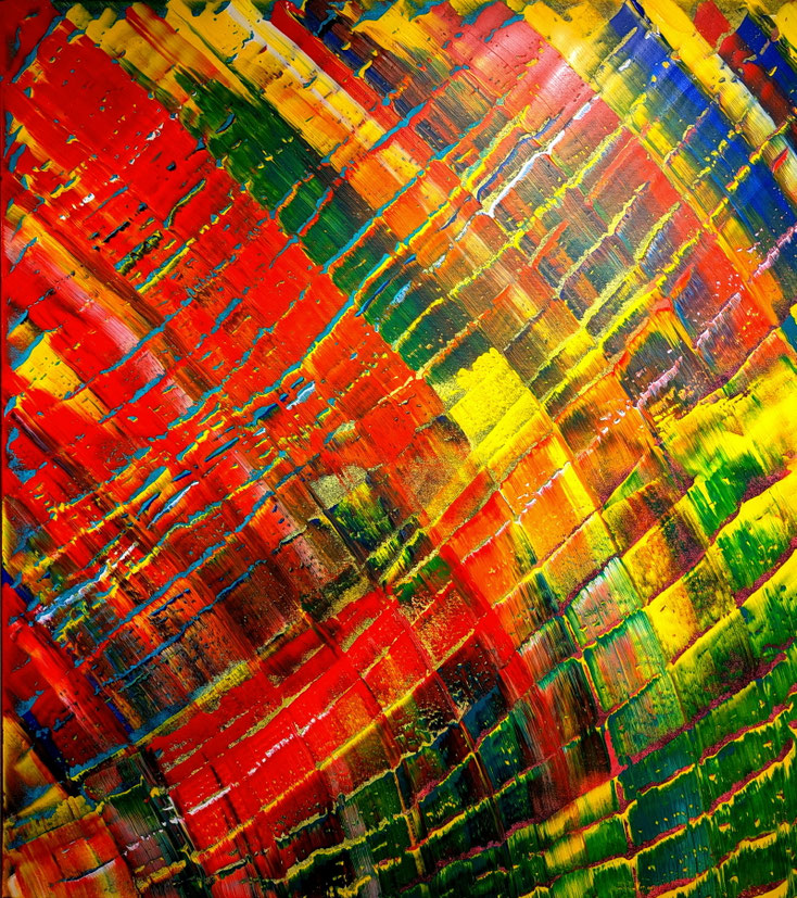 verbinde ich Zustände und Bedeutungen kompositorisch mit Farb- und Strukturelementen, die auf den ersten Blick einen positiven wenn auch durchaus nicht immer bruchfreien Impuls erzeugen. JUE
